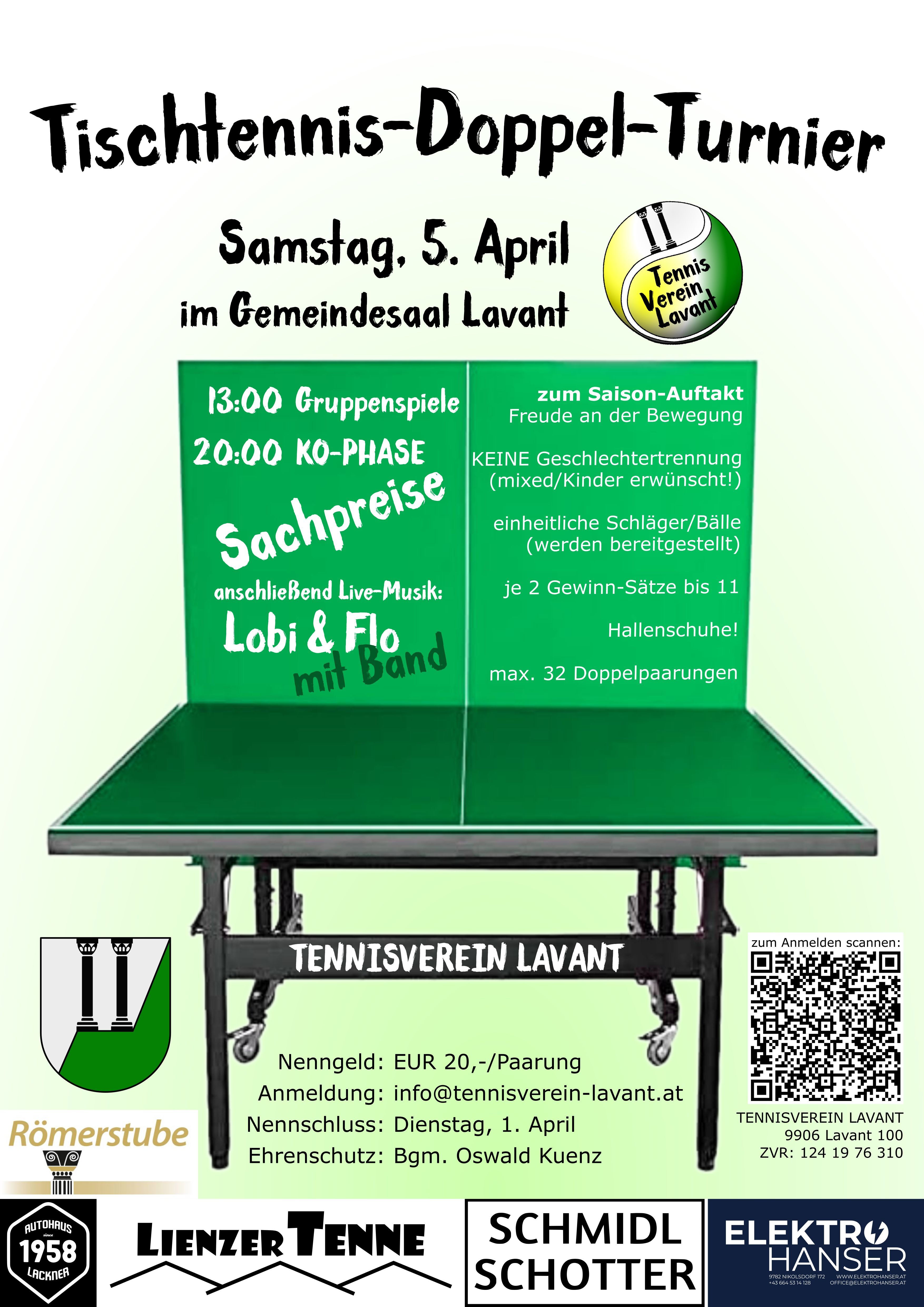 veröffentlicht am 13. Februar 2026 (von Christian M.)Es ist wieder soweit! Zum Saisonauftakt laden wir Euch herzlich ein, wieder am TT-Doppel-Turnier teilzunehmen. Anmeldungen bitte per Mail an info@tennisverein-lavant.at.