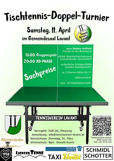 veröffentlicht am 26. Februar 2025 (von Christian M.)Es ist wieder soweit! Zum Saisonauftakt laden wir Euch herzlich ein, wieder am TT-Doppel-Turnier teilzunehmen. Anmeldungen bitte per Mail an info@tennisverein-lavant.at.